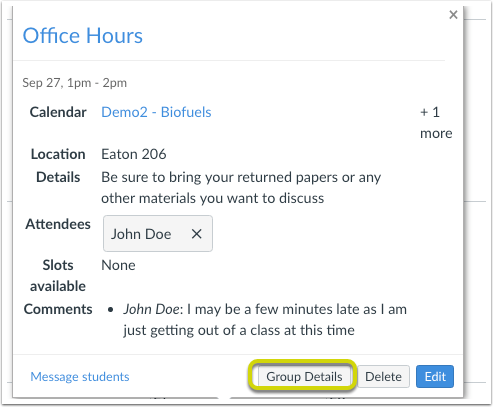 If you have created a Canvas Appointment Group for student sign-up, there are a number of places in Canvas that you can check which, if any, students have reserved a sign-up slot.