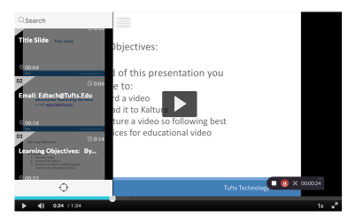 If your lecture capture includes recording a PowerPoint presentation on screen, Kaltura Capture will automatically create chapters for each slide in the presentation, allowing students to skip to the part of the presentation that is most relevant to them. The text of the title of each slide is captured and becomes searchable within the recorded video.